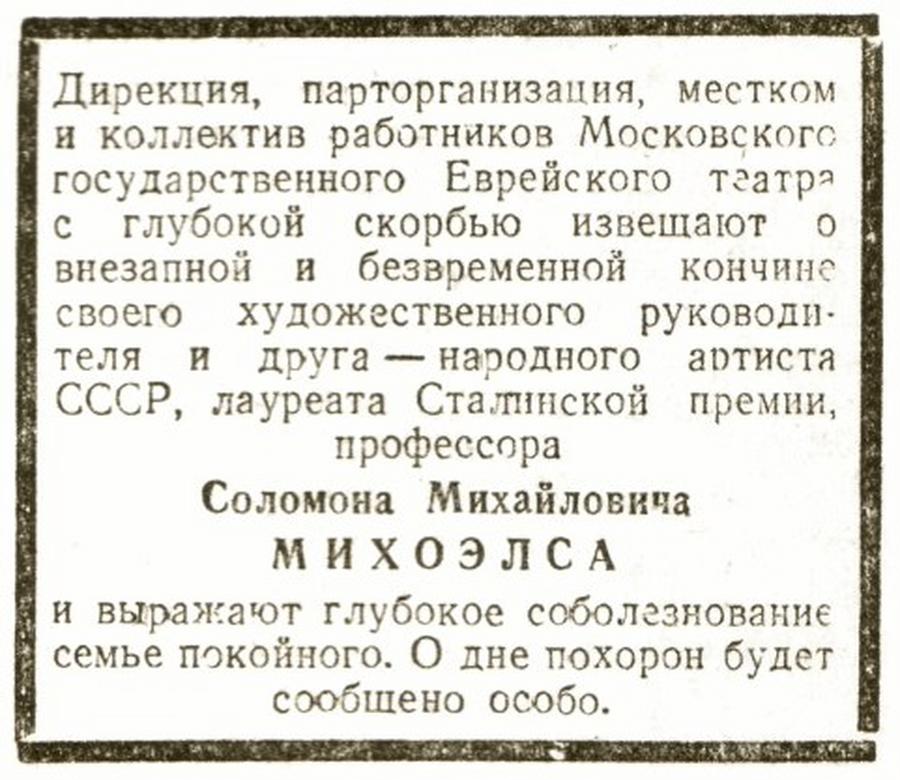 Убийство Михоэлса (13 января 1948 г.) в Минске, совершенное, очевидно, по указанию И. Сталина и выданное за «гибель в автомобильной катастрофе», стало началом ликвидации еврейской культуры и уничтожения ее деятелей в Советском Союзе. В 1952 г. в ходе дела врачей Михоэлс был объявлен «агентом Джойнта», и лишь после разоблачения культа личности Сталина имя Михоэлса стали постепенно реабилитировать. В Москве были изданы сборники статей Михоэлса и воспоминаний о нем (1960 и 1965 гг.; во 2-м из них — «Краткая летопись жизни и творчества»). В Израиле в 1984 г. вышла книга дочери Михоэлса — Наталии Вовси-Михоэлс (1922–2014) — «Мой отец Соломон Михоэлс». Центр еврейской культуры, открытый в начале 1989 г. в Москве, назван именем Михоэлса.