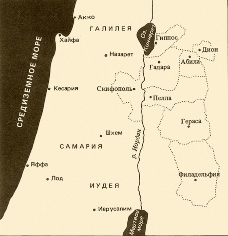 Считается, что Декаполис был образован Помпеем в 63 г. до н. э. после того, как он отвоевал греческие города, завоеванные Александром Яннаем на рубеже 80–70-х гг. до н. э.; возможно, однако, что возникновение Декаполиса относится к более раннему периоду. По Плинию (1 в. н. э.), в состав Декаполиса входили: Дамаск, Филадельфия (Раббат-‘Аммон, современный Амман), Рафана (точное местоположение неизвестно), Скитополис (Бет-Шеан), Гадара (Гадер, современный Умм-Кайс), Гиппос (Сусита), Дион (ныне Тель-ал-Ашари?), Пелла (Пехал, ныне Хирбет-Табакат-Фахил), Гераса (Гереш, современный Джараш) и Канафа (Кнат, современный Ал-Канауат).