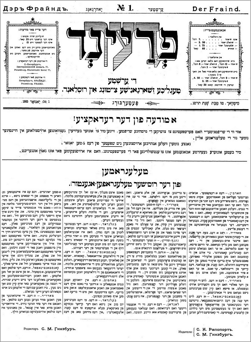 Издатель Ш. Раппопорт (1862–1928) добивался разрешения на издание газеты с 1895 г. Первый номер вышел 14 января 1903 г. с подзаголовком «Первая ежедневная газета на жаргоне». Хотя ранее в Российской империи издавались и распространялись другие газеты на идиш (первая — еженедельник «Кол мевассер» — выходила в Одессе еще в 1864–71 гг.), именно начало издания «Фрайнд» считается «днем рождения современной еврейской печати». Появление «Фрайнд» стало мощным стимулом для развития языка и литературы на идиш.
